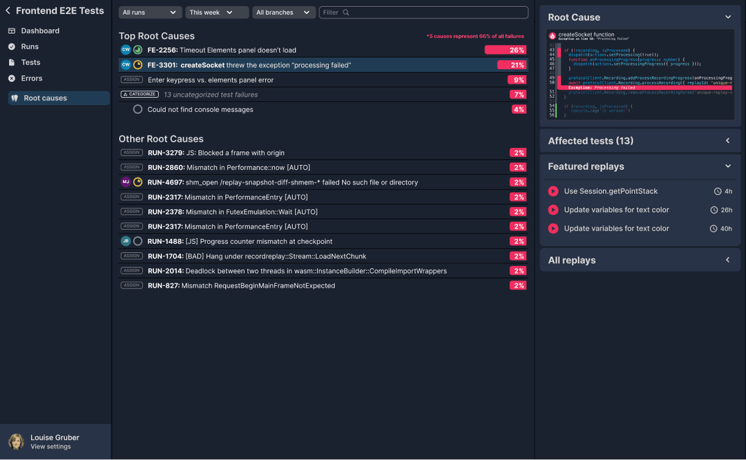 Our goal with Root Cause Analysis is to show you the top buckets which if fixed would address the majority of your test failures.